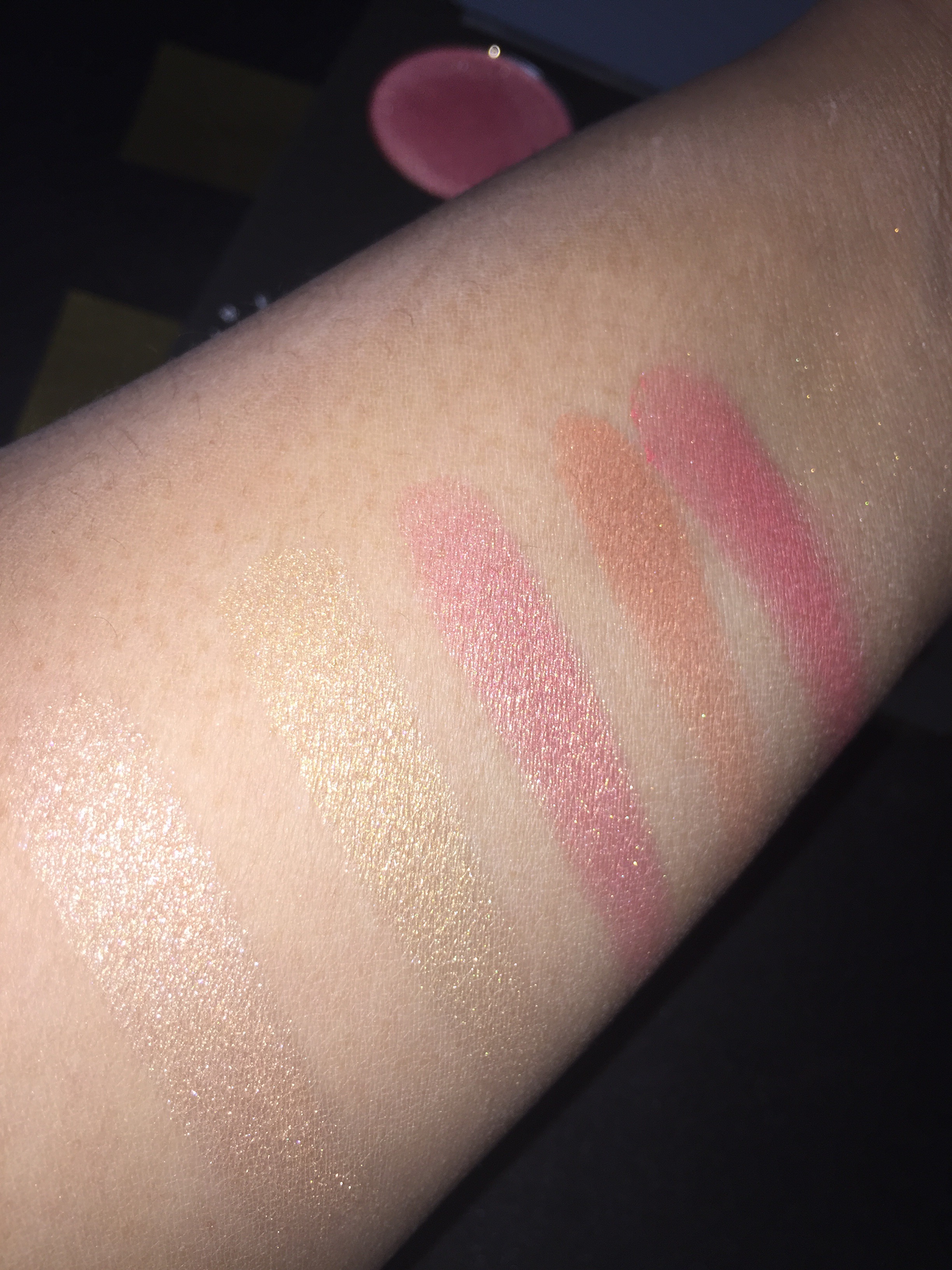 Swatches i dagsljus i följande ordning: Champagne pop, Prosecco pop, Rose Spritz, Amaretto och Pampelmousse. Detta är ett svep, man behöver verkligen inte ta i med andra ord.