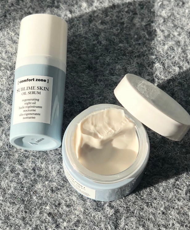 Jag använder Comfort zone sublime skin oil cream som både dag och nattkräm den är inte tjock som en cold cream men skyddar huden som en. Huden blir väldig lugn och studsig efteråt. Skin oil cream innehåller bland annat passionsfruktsolja som stimulerat kollagen och hyaluronsyre produktionen och Cikoria som ska hjälpa till att reparera receptorerna för vitamin D för ett bättre vitamin D upptag. Krämen luktar fräsch men doften försvinner rätt fort. Medan olje serumet upplevde jag inte som att den luktade något alls. Så till kvällen använder jag även oil serumet från samma serie innan och sen på med krämen.